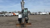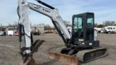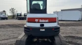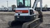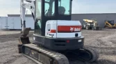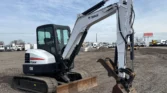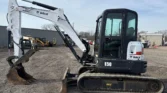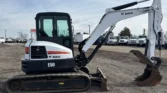 Bobcat 4-cylinder diesel with hydrostatic transmission. Enclosed cab with AC/heat. Equipped with auxiliary hydraulics, 76″ backfill blade, swing boom, 76″ stick, mechanical quick coupler, and hydraulic thumb. Includes 24″ bucket with teeth and 16″ rubber tracks.