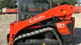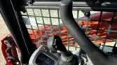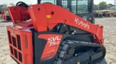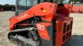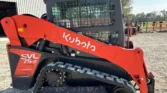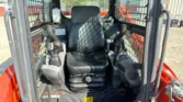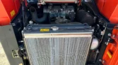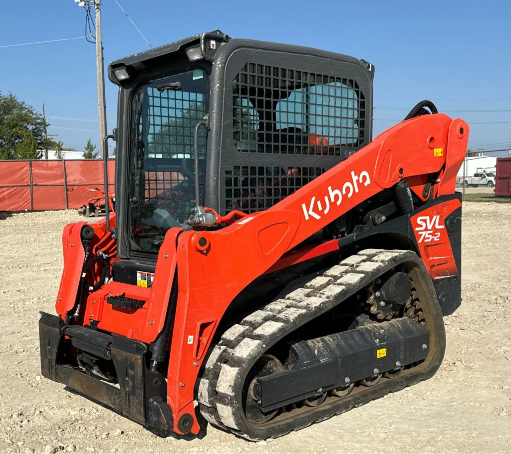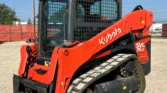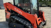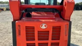 Kubota 74.3 HP 4-cylinder diesel with hydrostatic transmission and two-speed travel. Enclosed cab with AC/heat and hand controls. Equipped with auxiliary hydraulics and hydraulic quick coupler. 12″ tracks.