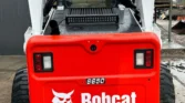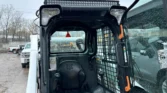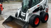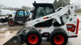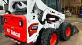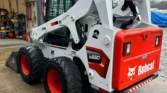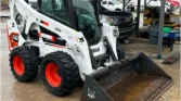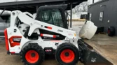 Bobcat 4-cylinder diesel with hydrostatic transmission and two-speed travel. OROPS cab with AC/heat, backup camera, foot controls, and monitoring system. Equipped with auxiliary hydraulics and hydraulic quick coupler. Includes 74″ heavy-duty bucket, 48″ forks, and 12-16.5 tires.