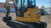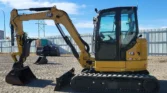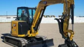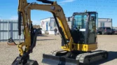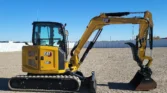 Enclosed cab with AC/heat, backup camera, and pattern changer. Equipped with two-way auxiliary hydraulics, 78″ backfill blade, swing boom, 4’3″ stick, hydraulic quick coupler (Cat PWR Coupler), and hydraulic thumb. Includes WBM 41″ cleanup bucket and 24″ digging bucket with teeth. Rides on 15.75″ rubber tracks.